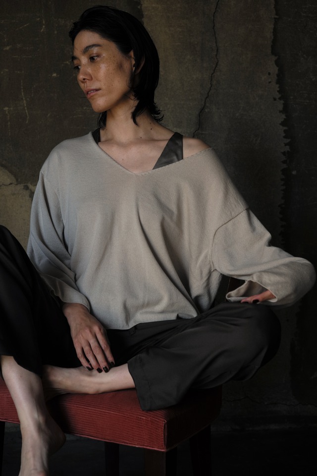 V-neck knit | Black, Beige | Free made in Japan cashmere 50% / silk 50% F: Shoulder 62cm | Waist 60cm | Length 62cm Clothes collection 何でもないように見えて、袖を通せばさまになるようなニットを念頭に、V-neck knitが出来上がりました。 ニットといえば秋冬のイメージが強いですが、衣替えの必要のない、出来るだけ長い時期着られるものを作りたいと思い、カシミヤとシルク50%ずつ混紡の糸を選びました。 真夏以外のスリーシーズンご活用いただけます。 非常に細く長い繊維を使用しているため、とても柔らかく、軽やかで、極上の肌触りです。 ホールガーメントで極力装飾を排し、シンプルさを追求しました。 Y-back bra等のブラにニットだけでも、既出のタンクトップ類やMesh cami、Mesh topと重ねる等、様々にお楽しみいただけます。 ゆったりしたラインからはリラックスした雰囲気を、首からデコルテ、肩へと流れるVネックからは少しのフェミニンさを。 胸元が開かない方がお好きな方は、T-back braやType-u tankと合わせると安心してご着用いただけます。 一回のご注文毎にunefig.ロゴ入りハンカチにお包みして納品いたします。 photos by Hiroko Matsubara(with model) photos by Hua Wang