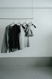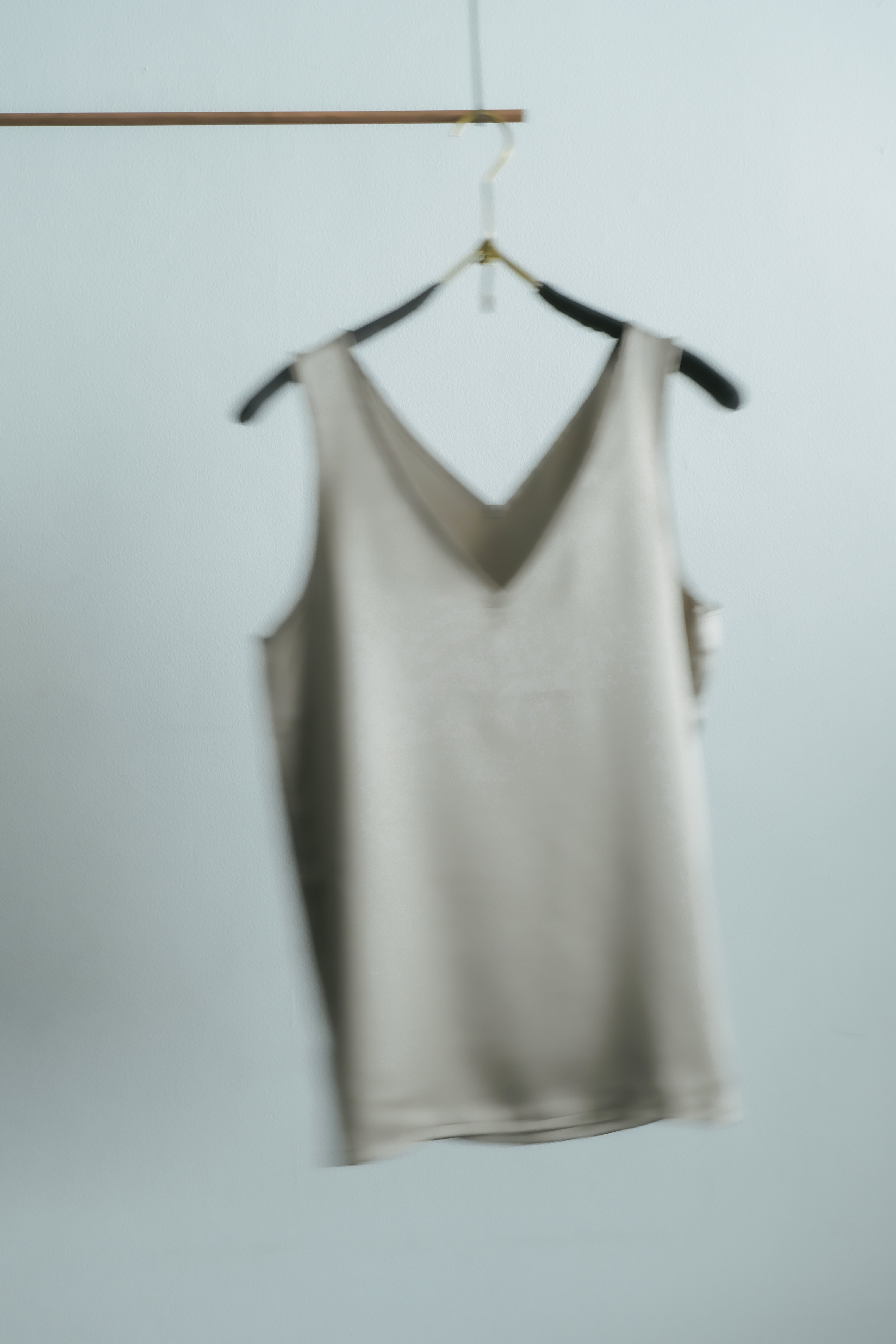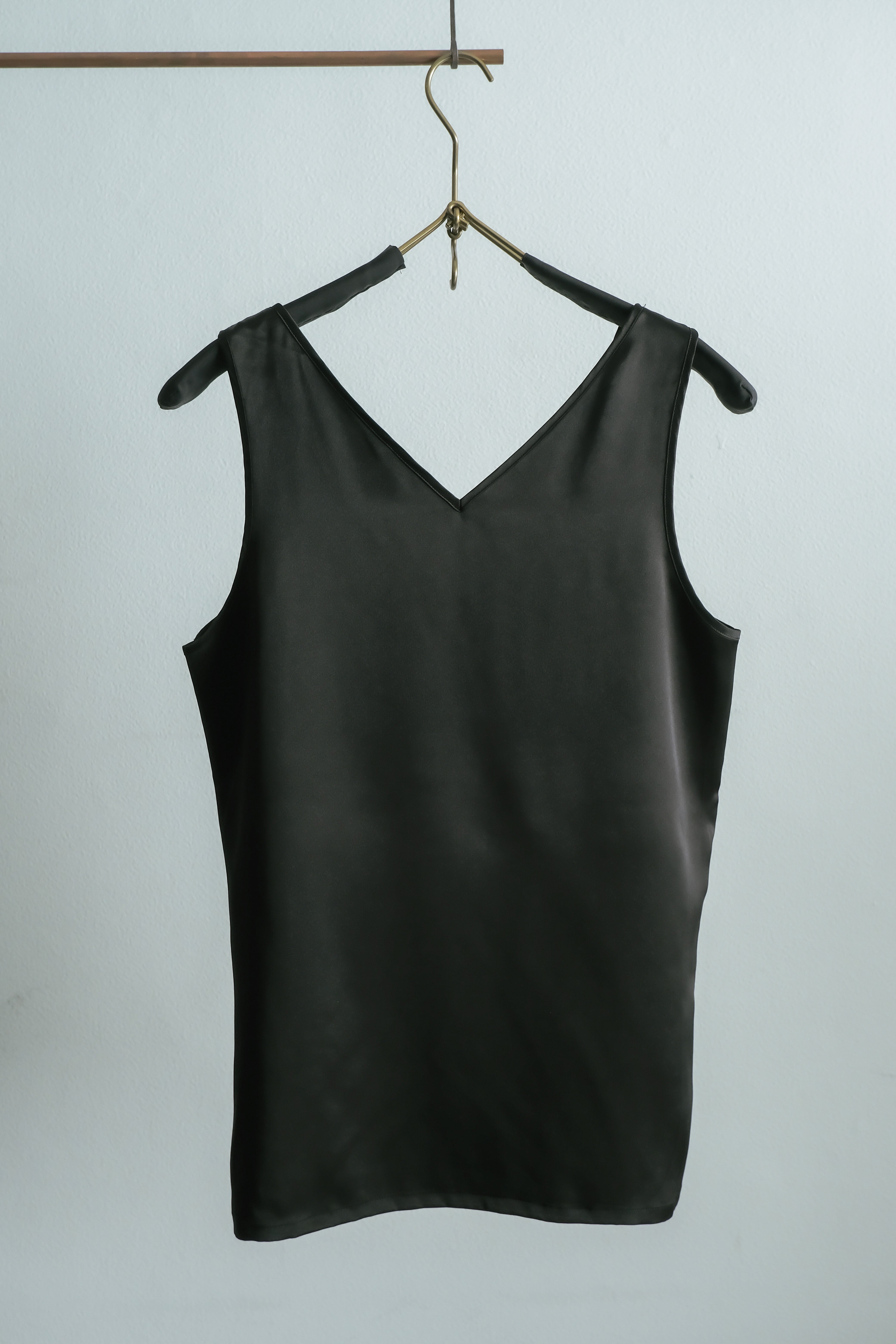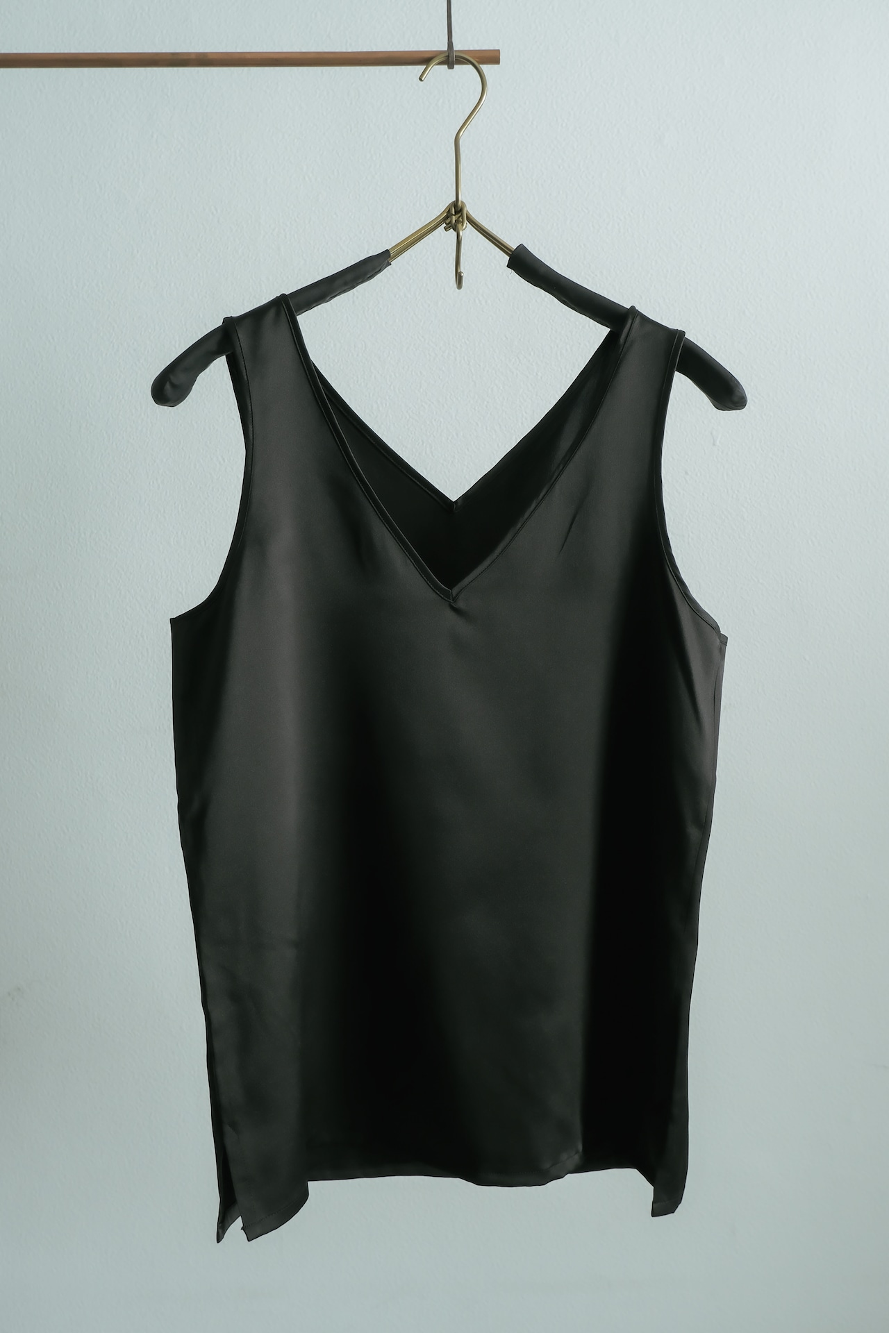 タンクトップをボトムスの上に出して着る時のポイントとなるよう、左右裾に小さくスリットを入れました。
