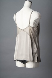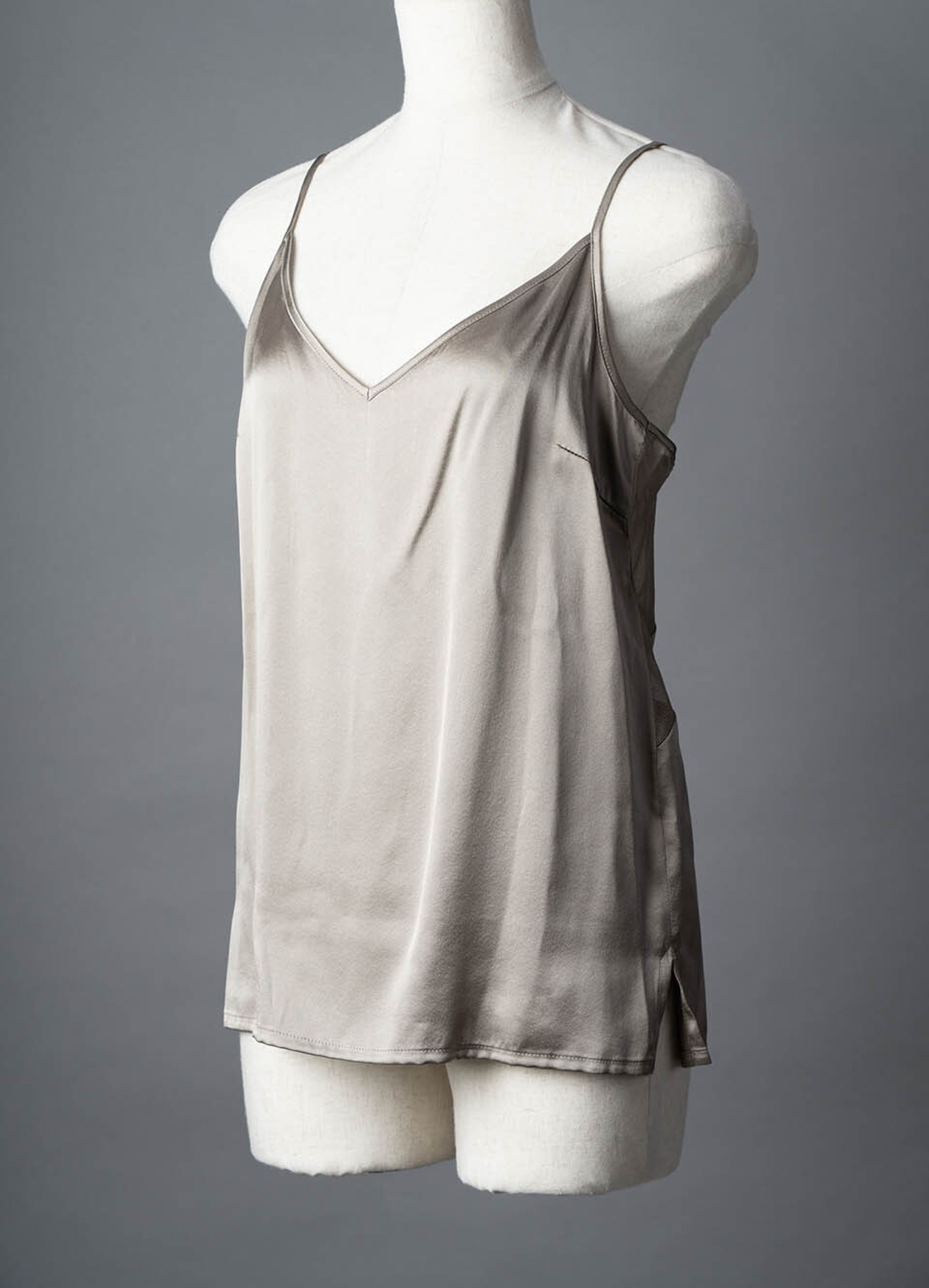 unefig.のキャミソールは、インナーとしても、一枚でトップスとしてもご着用頂けます。タンクトップをボトムスの上に出して着る時のポイントとなるよう、左右裾に小さくスリットを入れました。また、ボトムスにインにして着用した場合にも十分な長さが確保出来る着丈です。